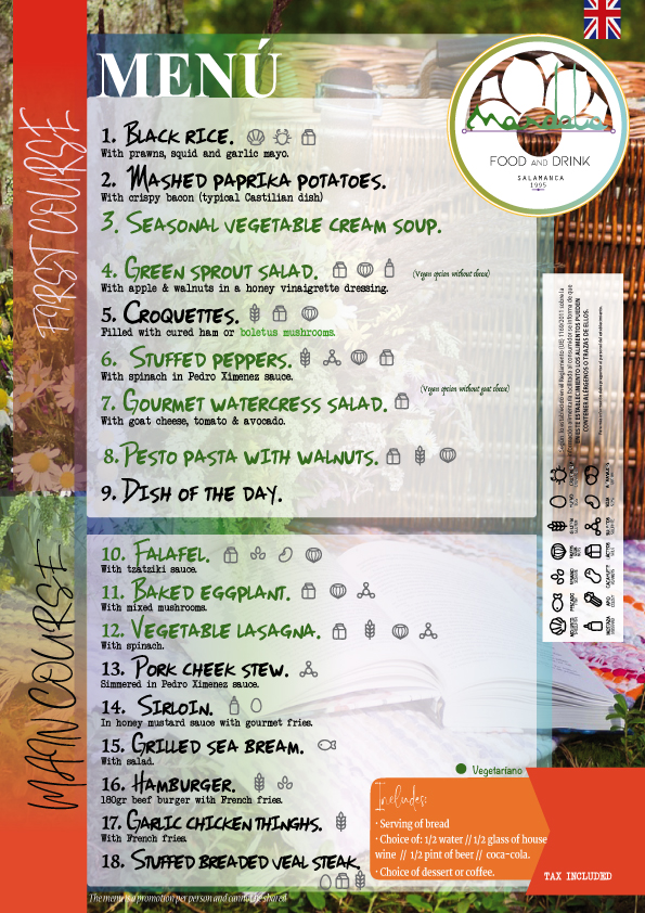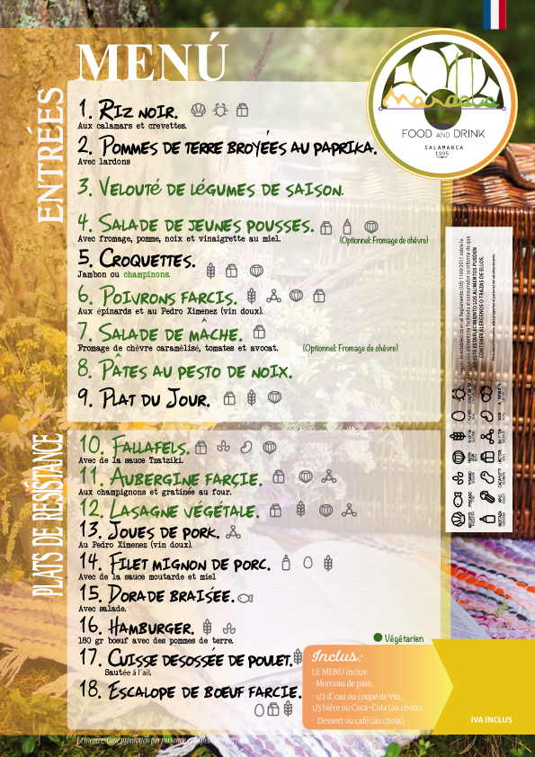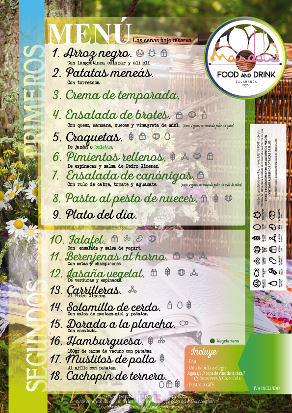 Menú, ensaladas, unas tapas, una porción de tarta, helado, bocadillos y sándwiches o bollería y tostadas.